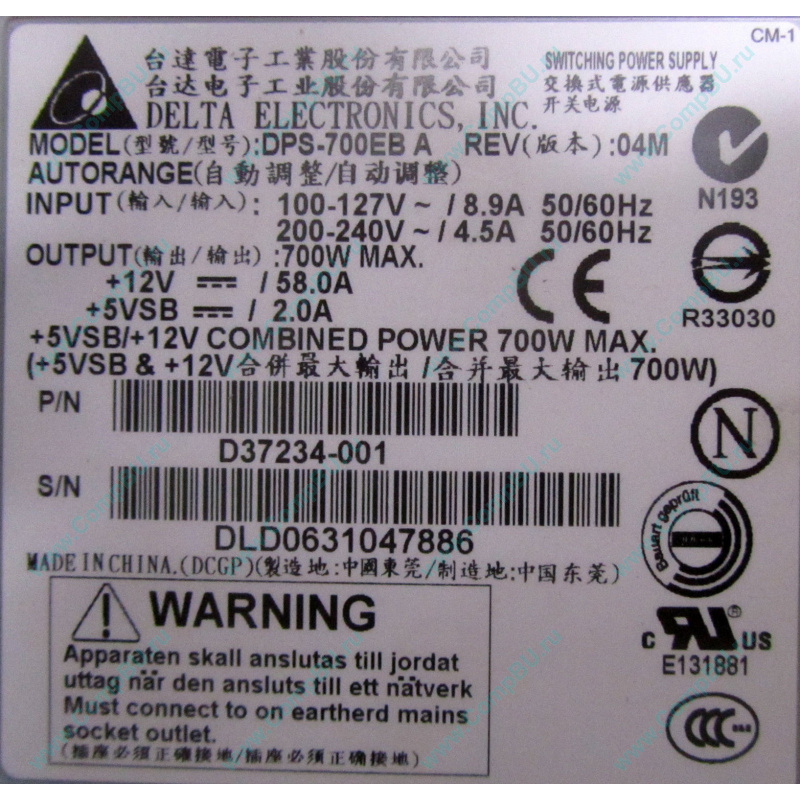 БУ серверный блок питания 700 W D37234-001 Delta Electronics DPS-700EB A Rev:04M для корзины AC-025 (D29981-001 / C41626-008 / C41626-009 / C41626-010) серверного корпуса Intel SR2400.