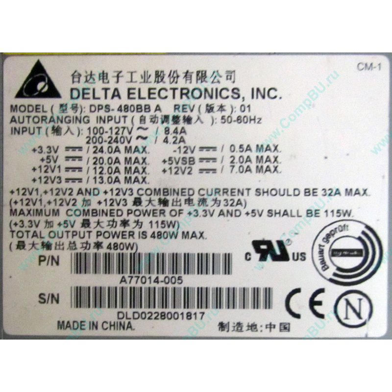 БУ серверный блок питания 480 W A77014-005 Delta Electronics DPS-480BB A Rev:01 для серверного корпуса Intel SR2300.